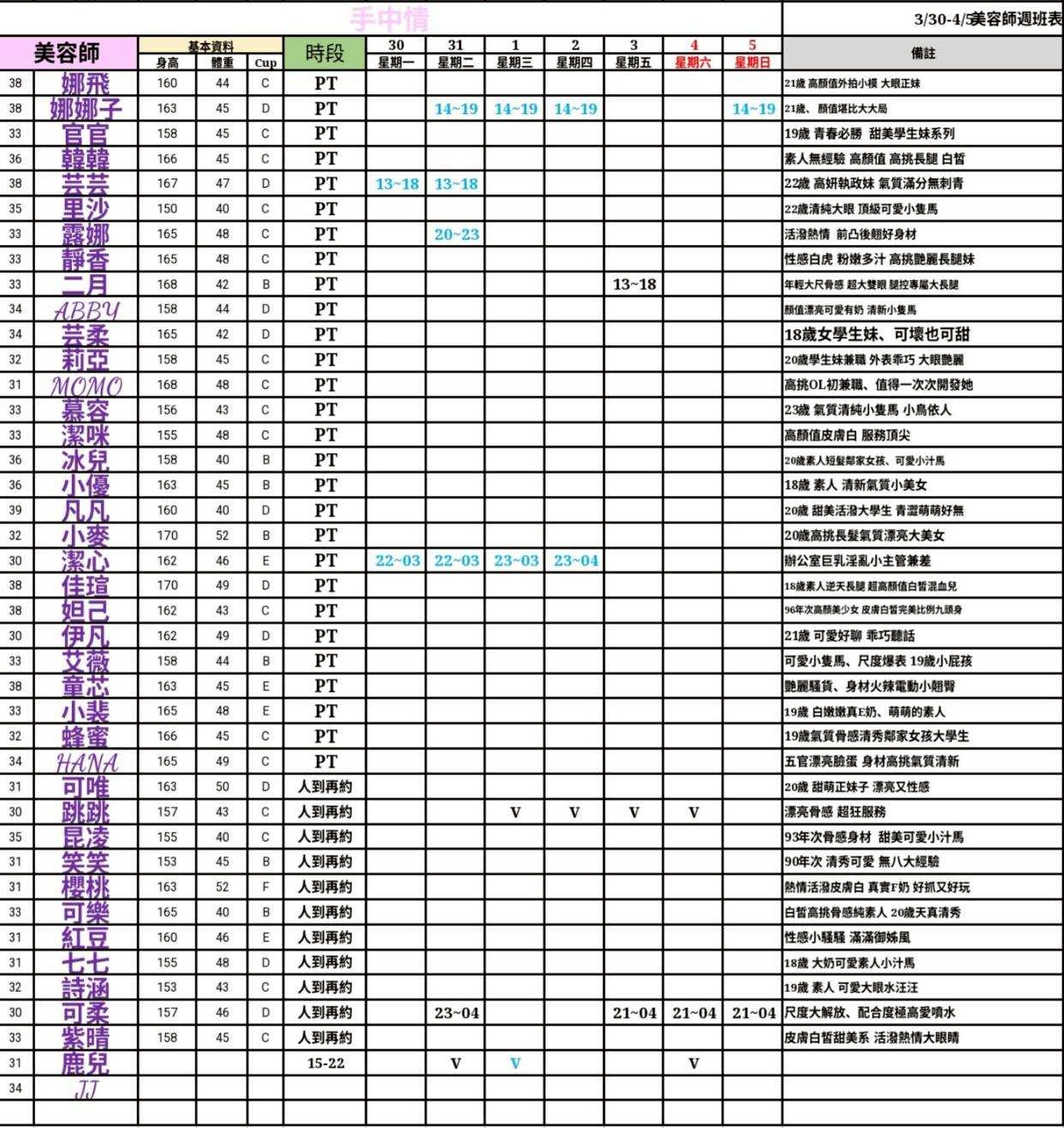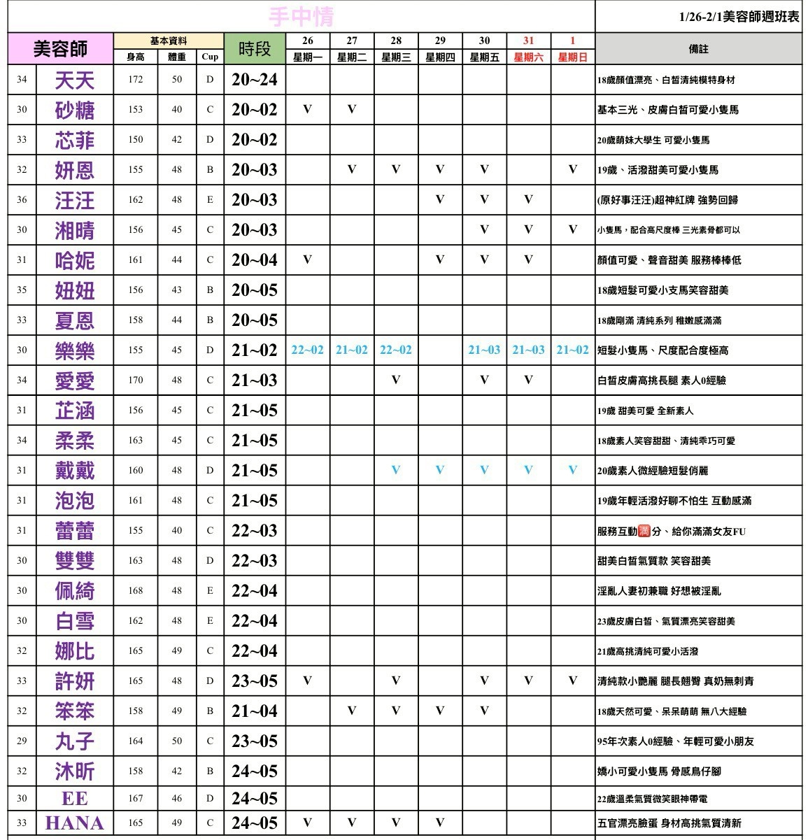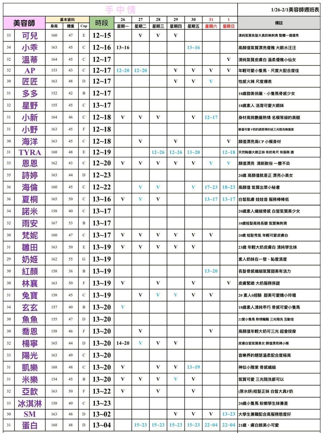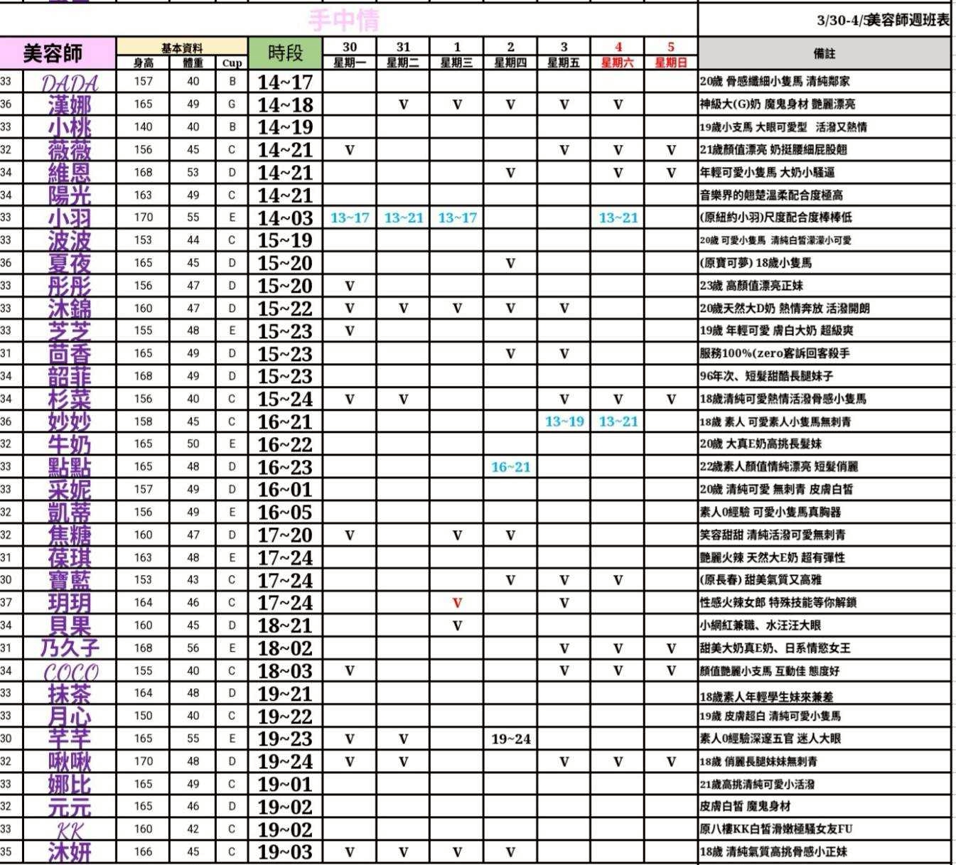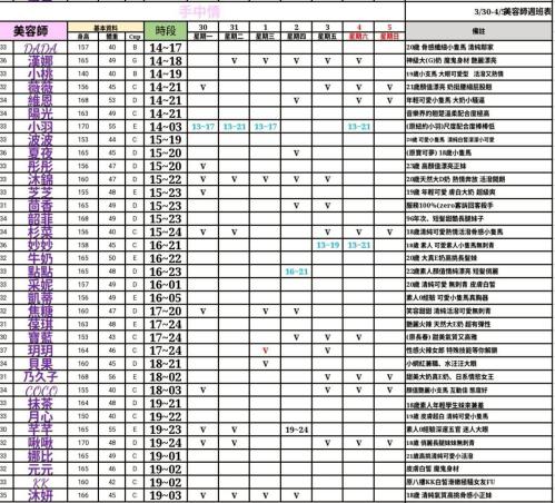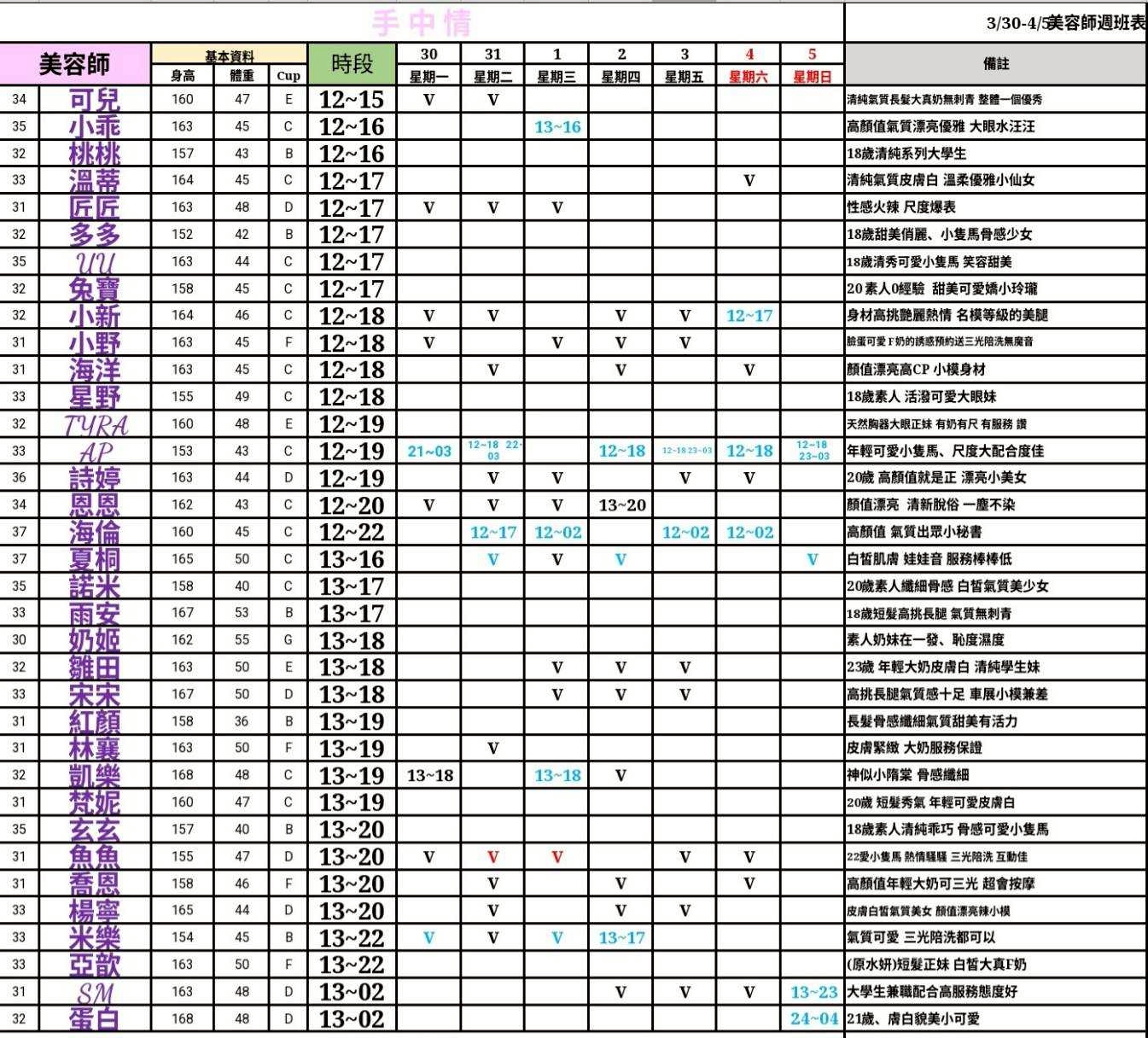- 有打 V 為報班、時段代表當日的上班時段(不一定有空班)